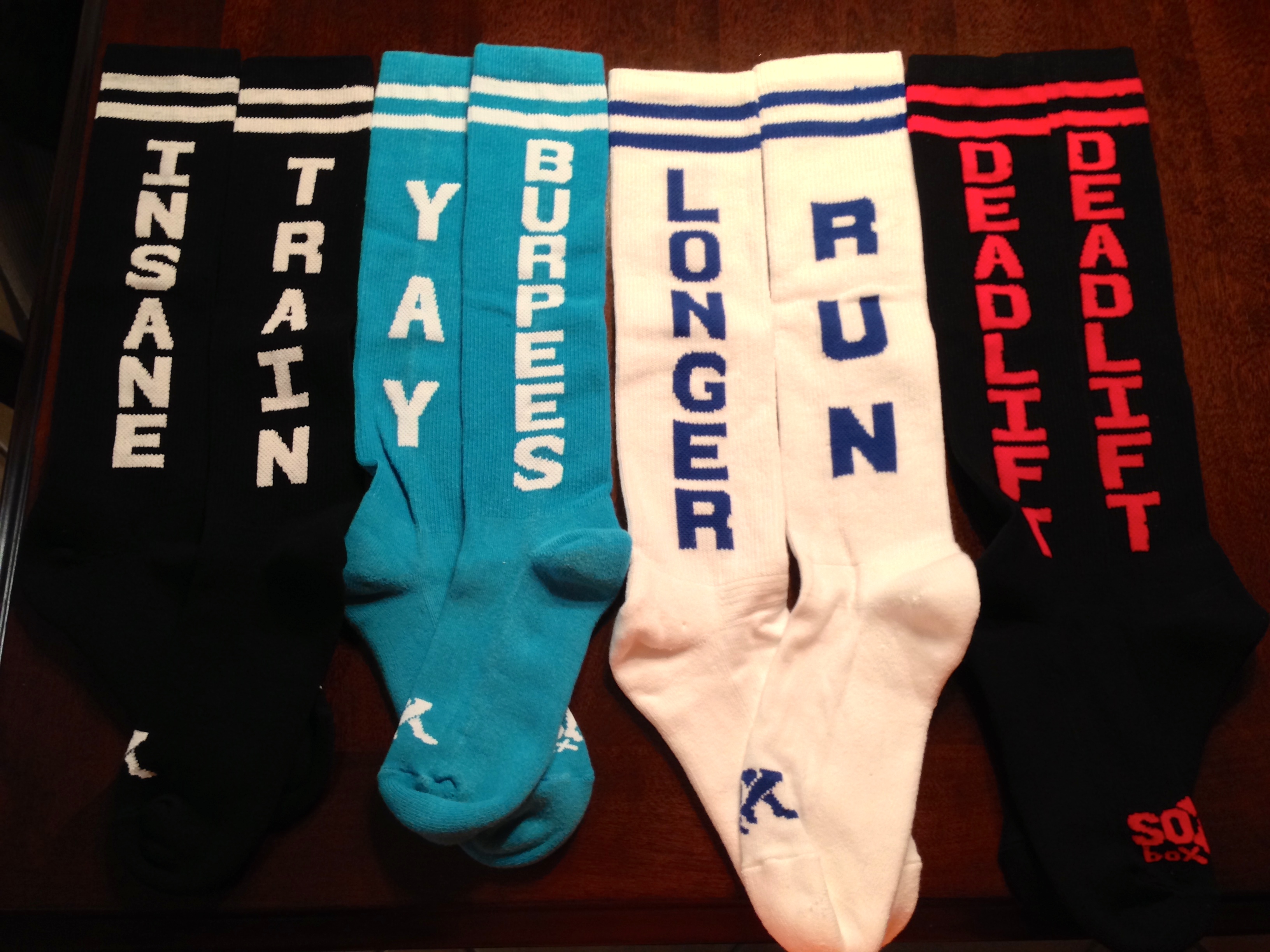 My Sock Box order came in yesterday!Β (please ignore my gross ugly shoes). So I sported my Train Insane socks tonight and I think that was the magic behind the pull up. π If you haven’t checked out the Sox Box yet, go do it now! Click Me! They really are fun! (I am still wearing them now, with my awesome house shoe moccasins.