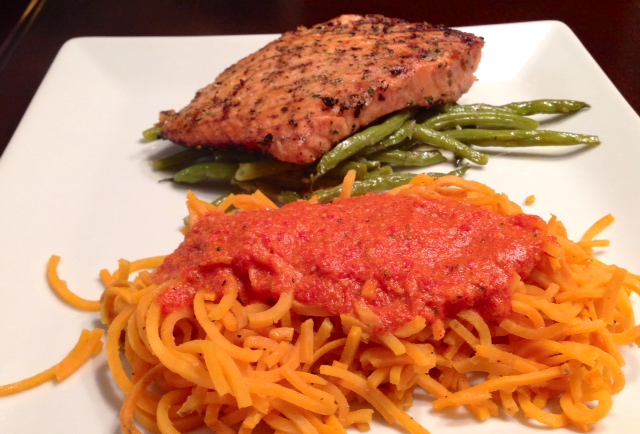 I decided to make a cream sauce to go on top of the sweet potatoes based on a recipe I saw over the weekend. I didn’t follow that recipe, because I had my own idea of what I wanted to use based on what was already in the kitchen. I had a bag of cherry tomatoes that had been patiently sitting at the back of the fridge for probably 3 weeks. They were on tomato life support.  I have this weird obsession with things “not fulfilling their destiny” and I project it onto inanimate objects like food, or tools, or whatever. And I was sad for like, a week, thinking I was going to have to throw these cherry tomatoes away, and I just kept prolonging that inevitable task and I’m glad I did, because tonight I threw them into a blender with some roasted red bell peppers, garlic, shallots, olive oil and spices and a bit of canned tomato sauce and made a Roasted Red Pepper and Tomato Cream Sauce to serve over the sweet potato noodles. I had some half and half in the fridge and added some splashes until the color pleased me and let it simmer away. Hooray for saving those little tomatoes! They fulfilled their destiny so wonderfully!