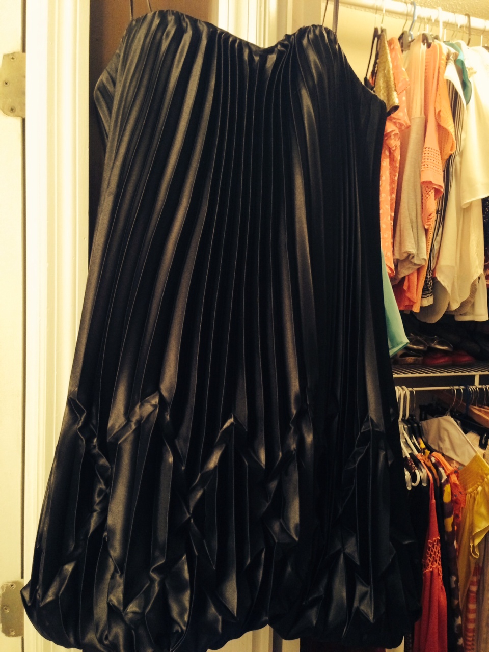 And then I decided to try on that ONE thing. Every woman has that ONE thing in their closet that they keep hanging up, somewhere in the back, and will take out once a year to “try” and then shove back. My “one” thing, is an amazing ABS by Allen Schwartz black satin cocktail dress.