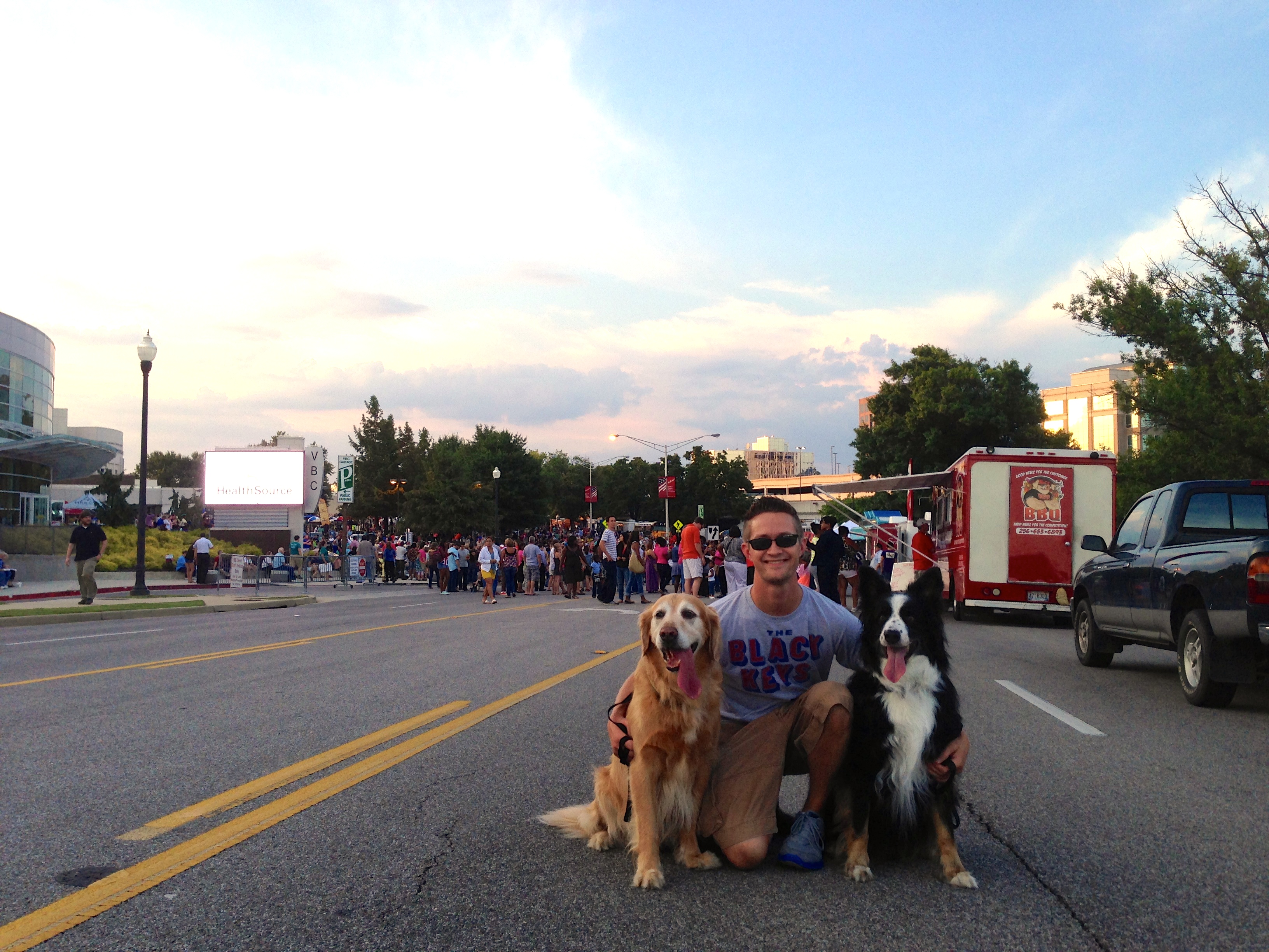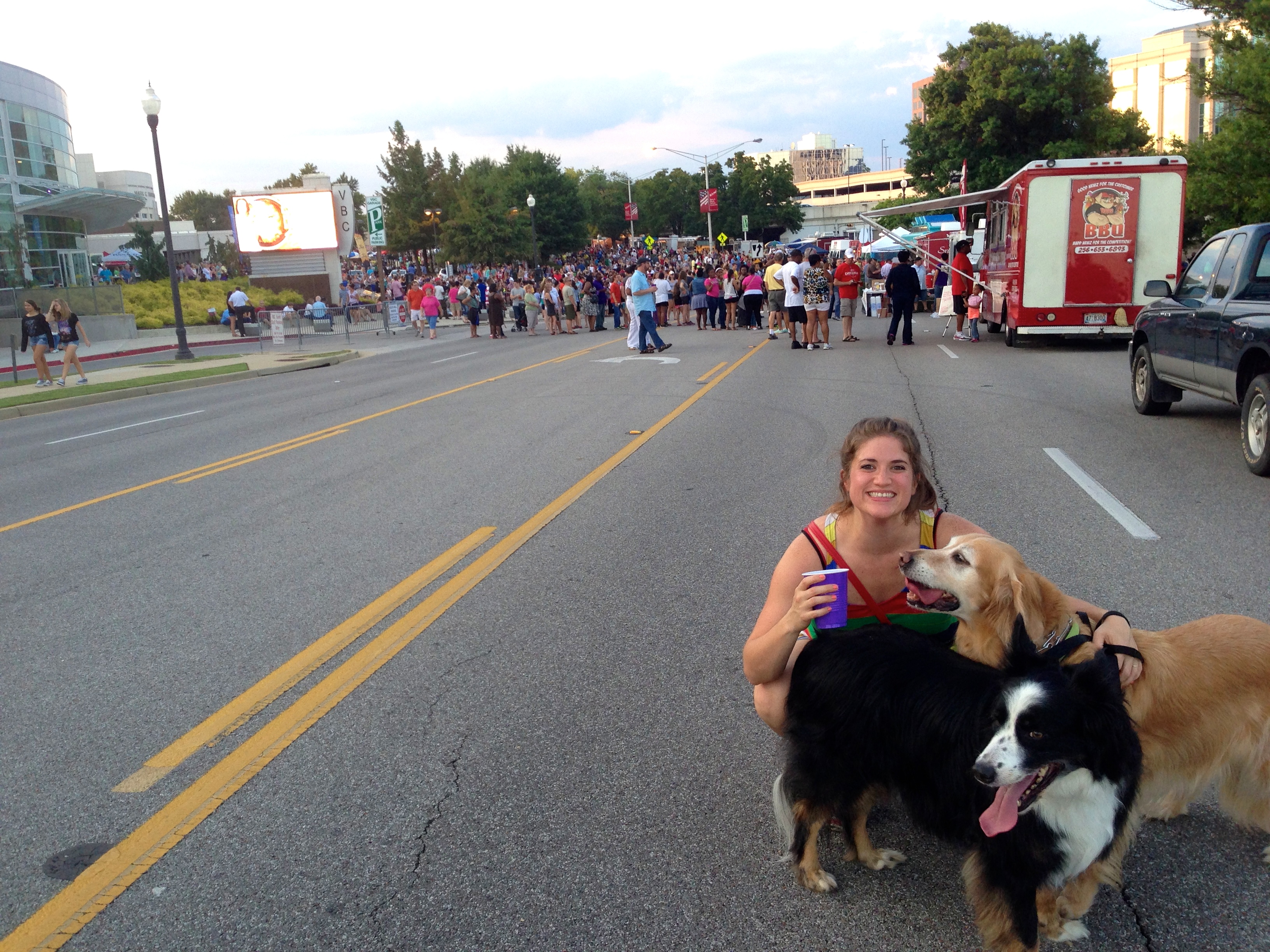 I must admit though, we don’t really do much with them outside of our home. But we recently acquired a fun Jeep Wrangler, and one of the specific reasons we got it was so that it could be our pup-mobile. This past Friday night, downtown Huntsville hosted an awesome Food Truck Rally (they are becoming a regular thing, getting better and better and bigger and bigger each time) so we took the top off the jeep, loaded the dogs, and headed that way.