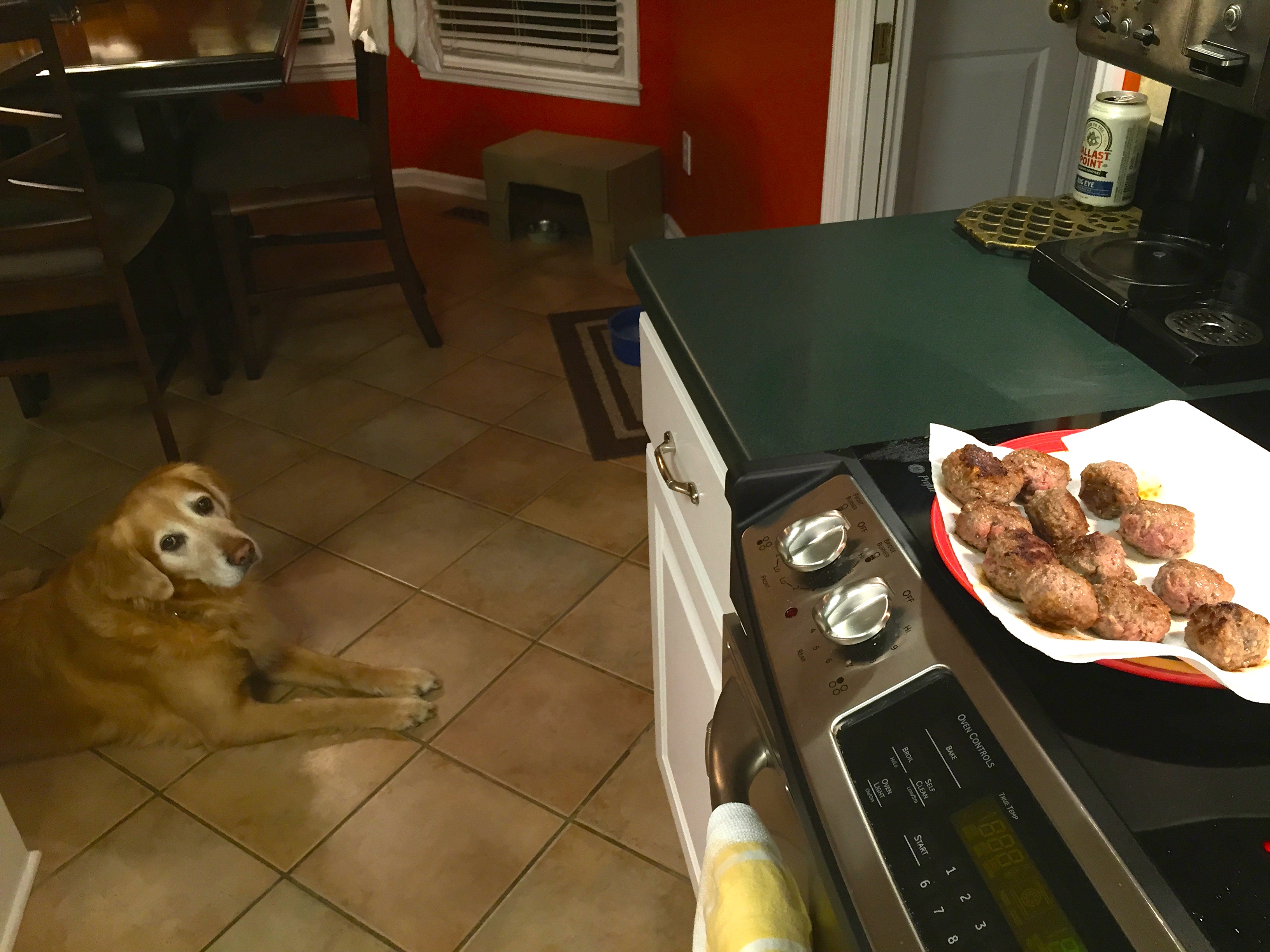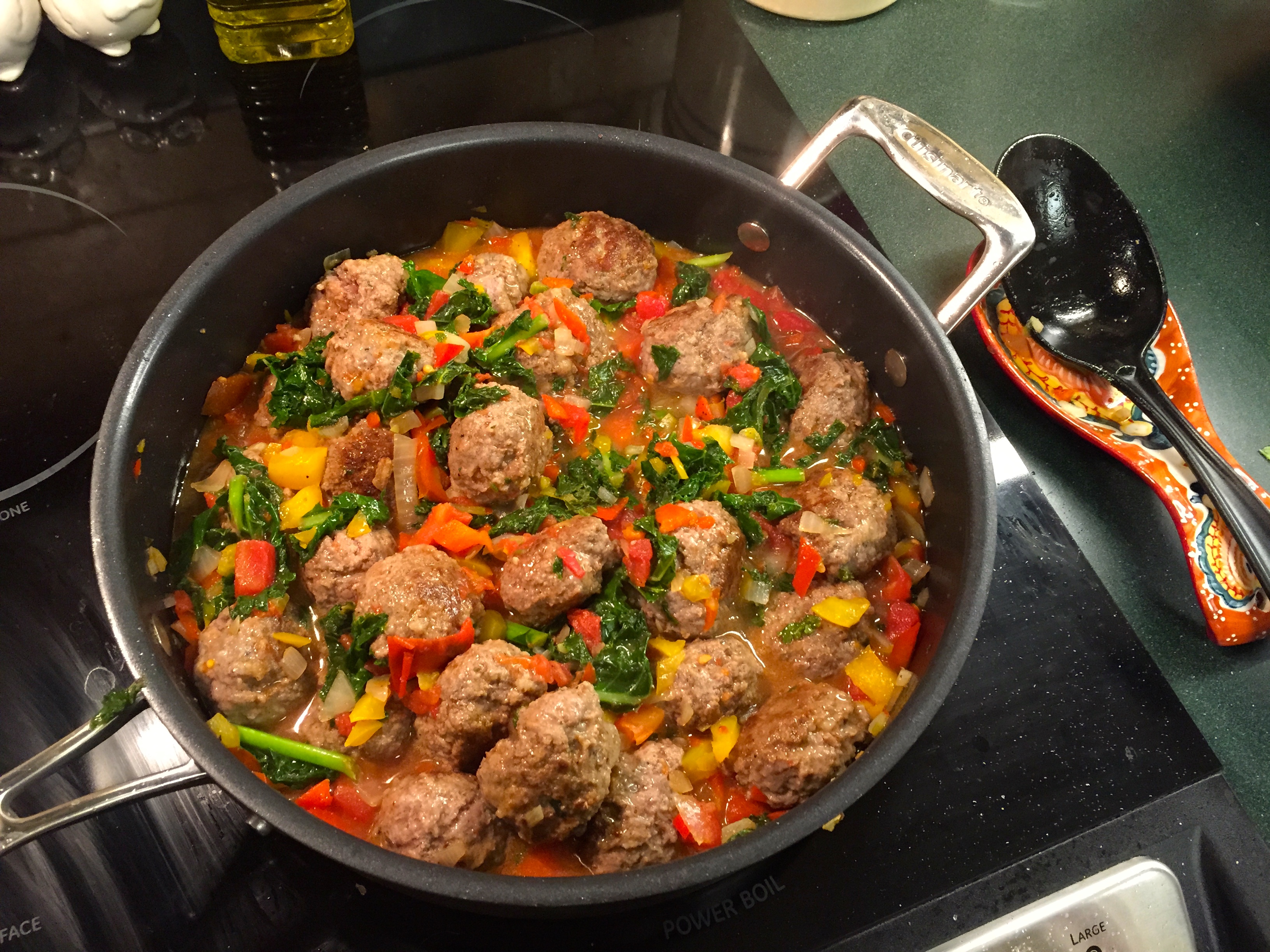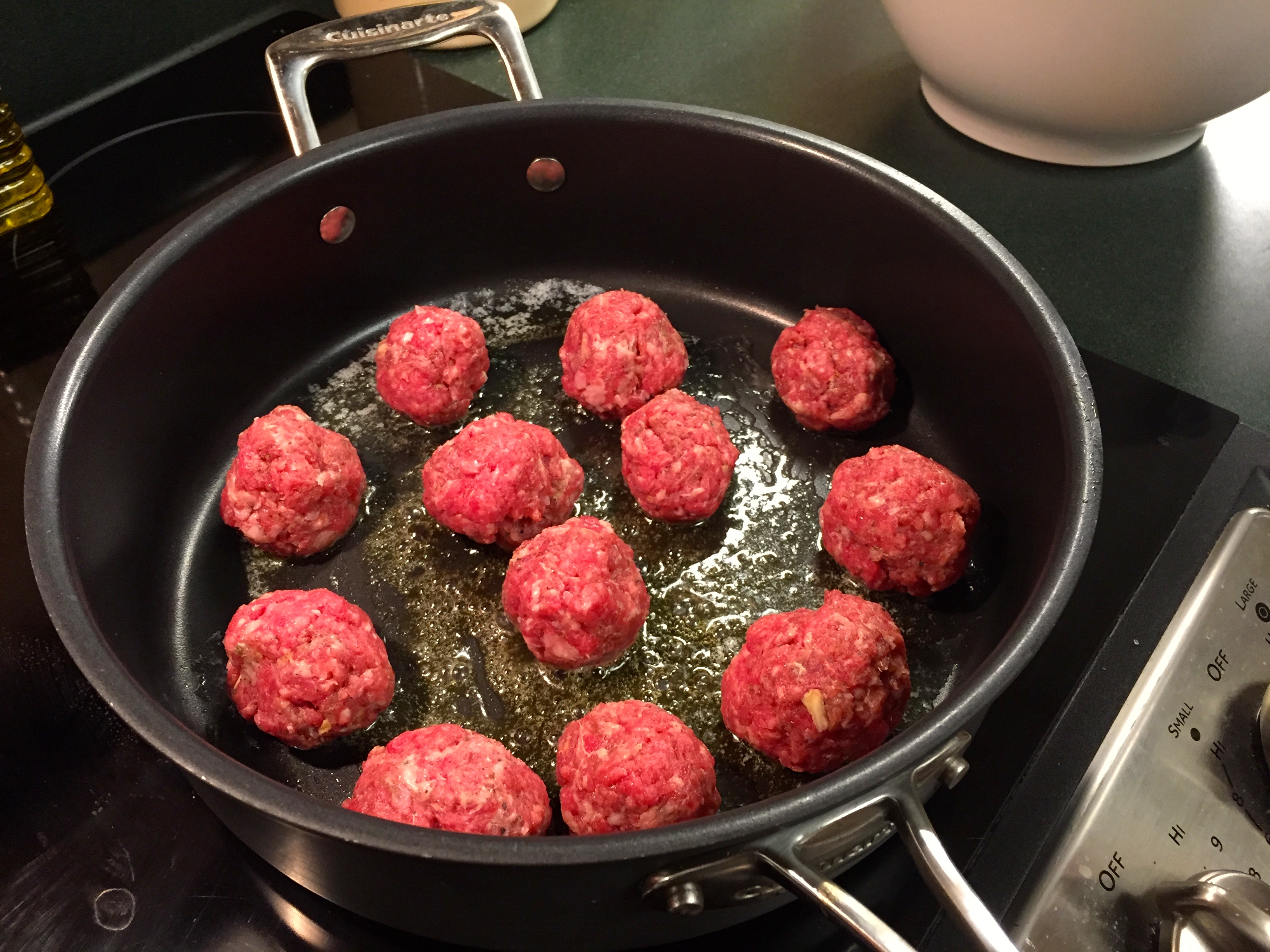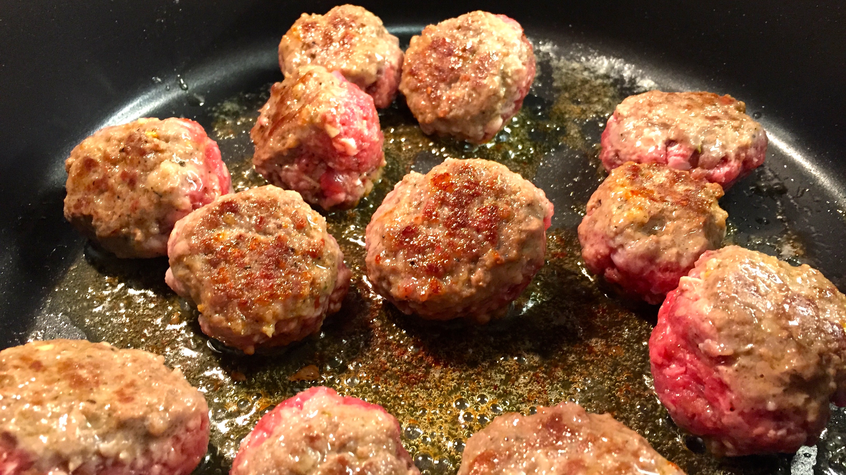 To begin the process, I made the meatballs fairly quickly. I mixed the two meats with some basic seasonings (S&P, garlic, red pepper flakes and some other spices. You can use whatever you like!) Then, I heated a little olive oil and Kerrygold butter in a pan and then browned them.IMG_7497I did mine in two batches. The goal here is to sear them on both sides, but not to totally cook them all the way through. They will go back into the pot later on to simmer and that’s where they will cook through.IMG_7498 IMG_7500Fair warning: when these start to brown, animals will begin migrating into the kitchen much like, I imagine, they did to Noah’s Ark.IMG_7503