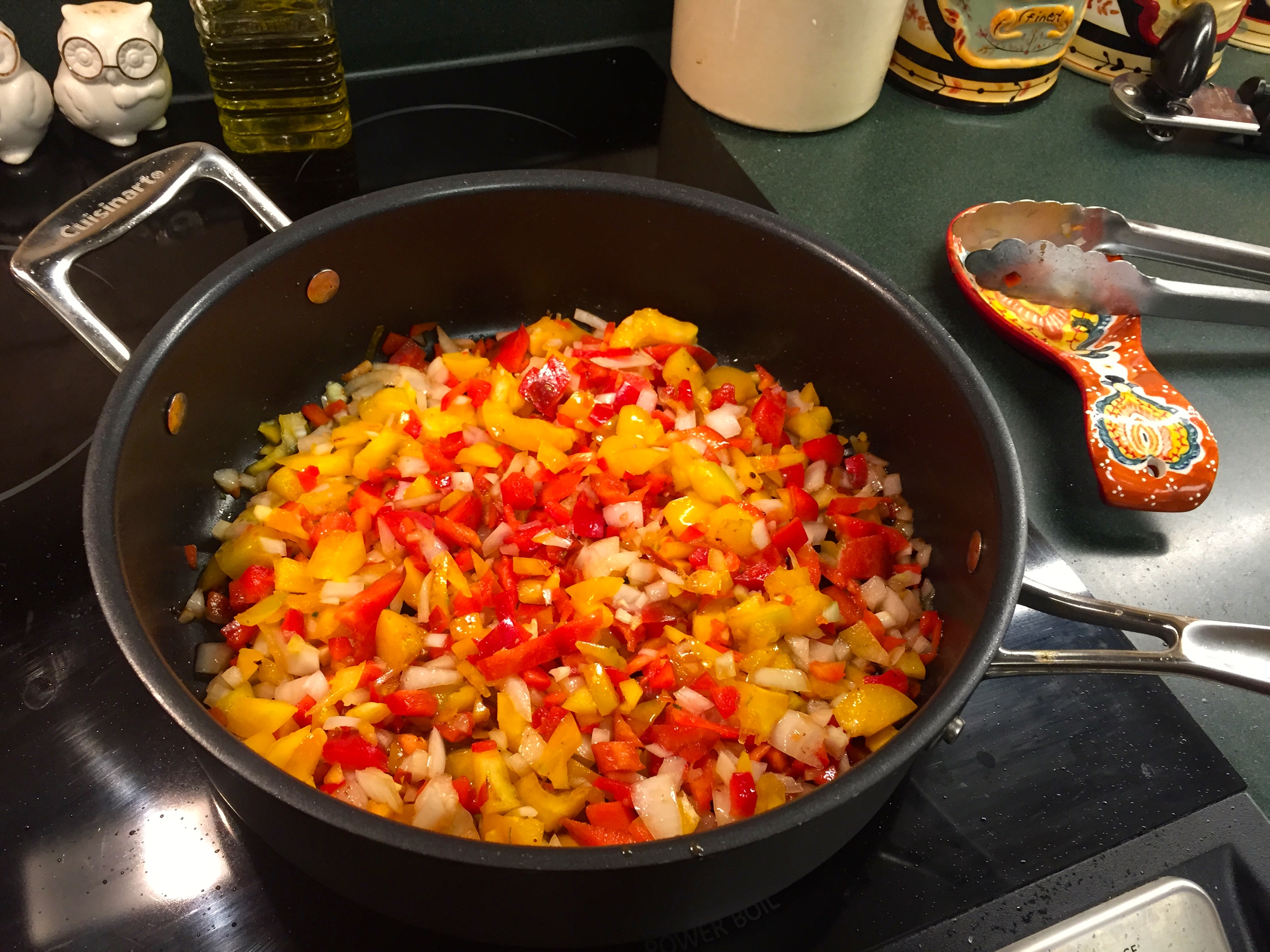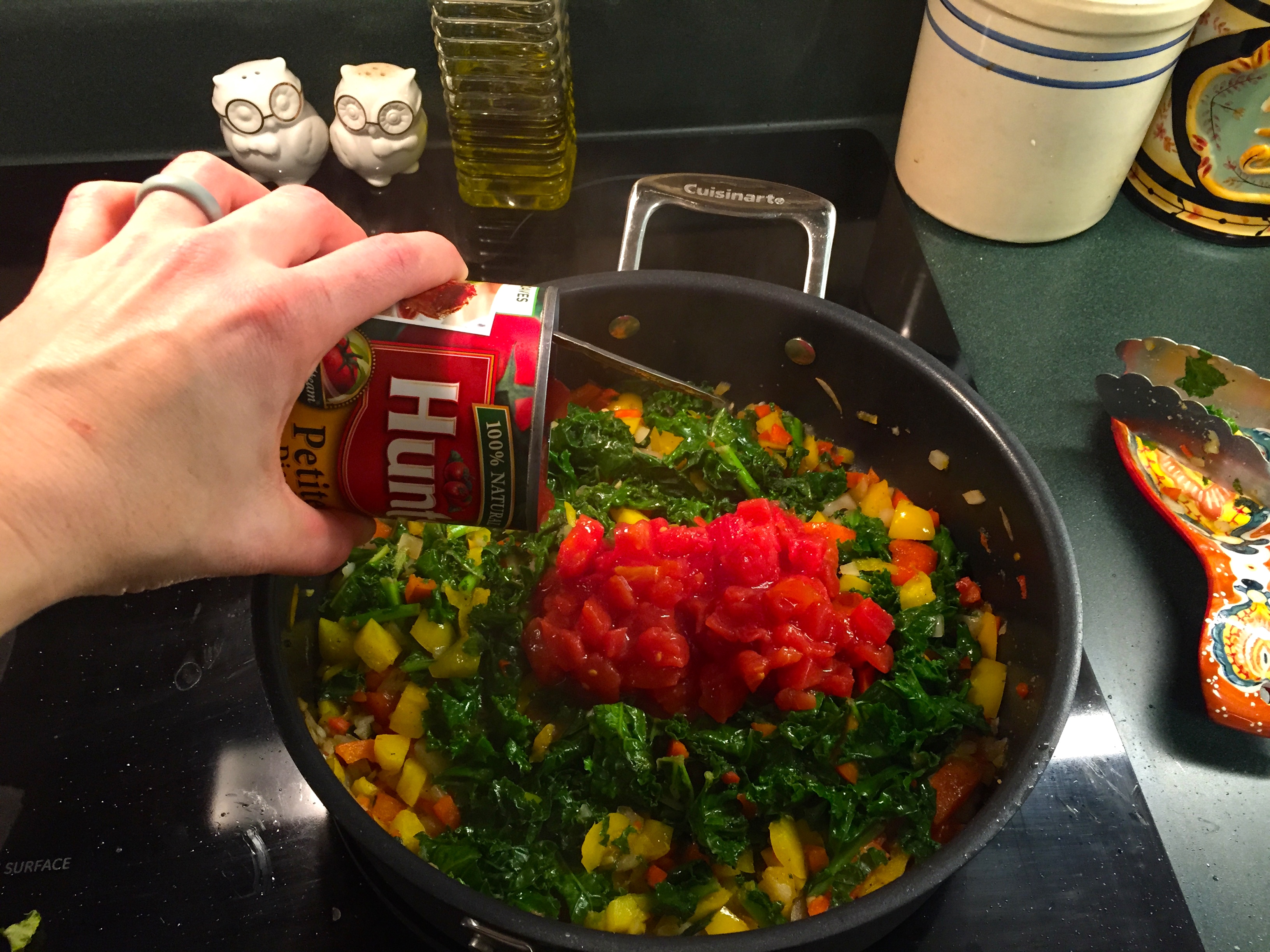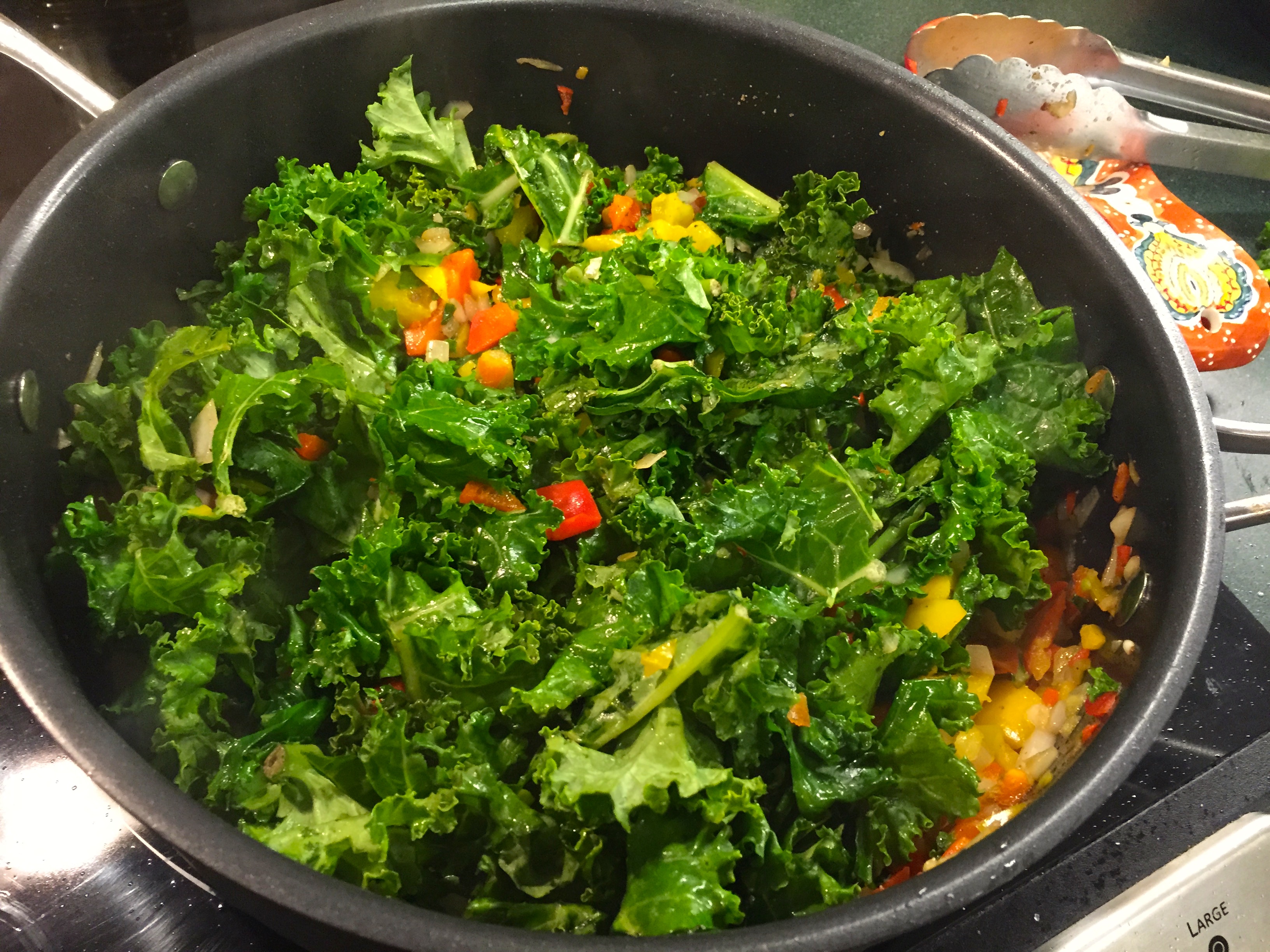 One thing, when you’re chopping your peppers up- do me a favor and pause to smell them. The wonderful fresh scent of chopped sweet bell peppers will take you to magical places, like a lazy, warm summer night. Oh I can’t wait for those.IMG_7505After a few minutes, add your kale.IMG_7506Stir this around and then set your lid on top so the kale can wilt and cook down, just takes 2-3 minutes.