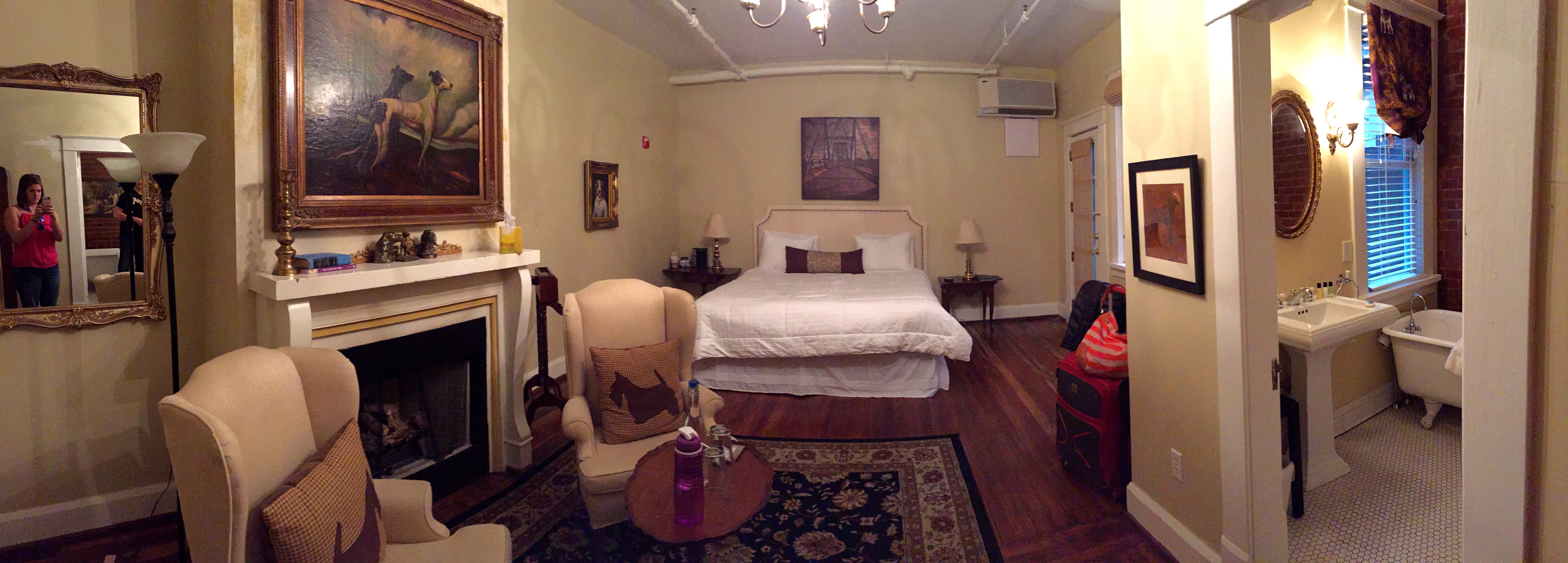 Here is a pano of our room- it was gorgeous!! I wish I had taken a few more pictures of the space before we messed everything up π All of the floors throughout the inn are the originals hardwoods that creak beneath your feet. We were able to peak in to a few other rooms too and they are all different with varying levels of “poshness”. I imagine they all have little themes too; ours had a dog theme. Our bathroom also had a clawfoot tub! I’m a bath connoisseur of sorts, so after we got back from the concert I hopped right in. We even had a private balcony that had a two person jetted tub on it! We didn’t have time to enjoy that though.