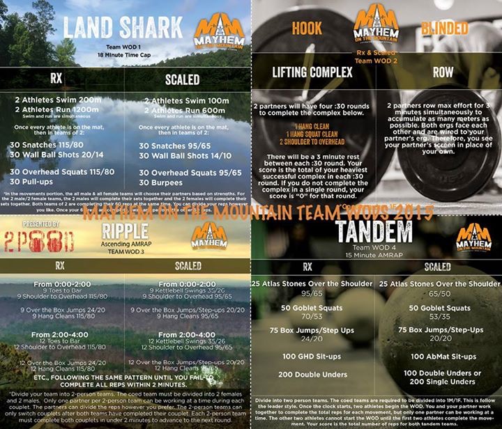 The competition was put together by Forge Fitness, and is named “Mayhem on the Mountain”, taking place in Oak Mountain State Park in Birmingham, AL. The event was two days, individuals being Saturday and Teams being Sunday. You could go Rx or scaled, and they released the workouts prior to the event, so you could strategize, practice, and second guess your decision for signing up 🙂