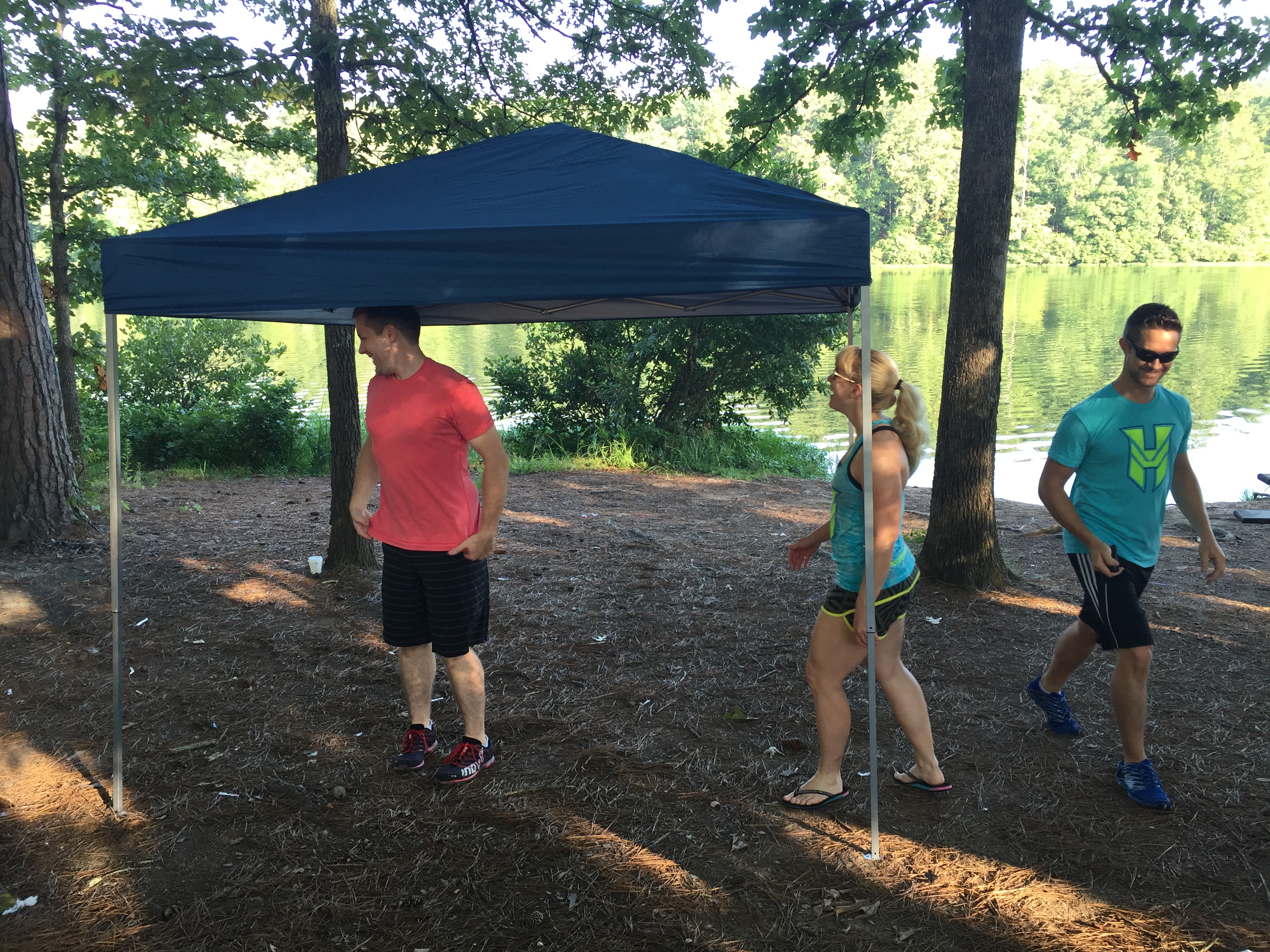 Stud in the red shirt is Mandy’s hubby Josh. They bought a canopy for our group to enjoy!! Luckily we were in the tree line but the canopy helped keep us protected from stray sunlight and falling sap/pine cones. The landscape was beautiful. We were right on the water!