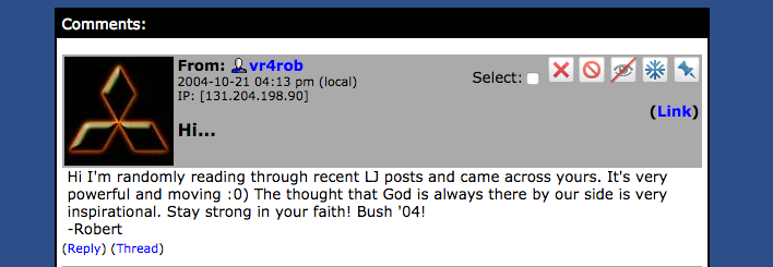 “Who is that?!” I wondered. I had never had a stranger read my blog before. I quickly clicked on this person’s blog profile and began scrolling through recent entries they had made. From what I gathered, it was a guy around my age named Robert, and from what I could tell after about 15 minutes of reading, not a total weirdo. We had similar interests (music, food) and were both attending college. “Hmph! I’ll say something back to him.”