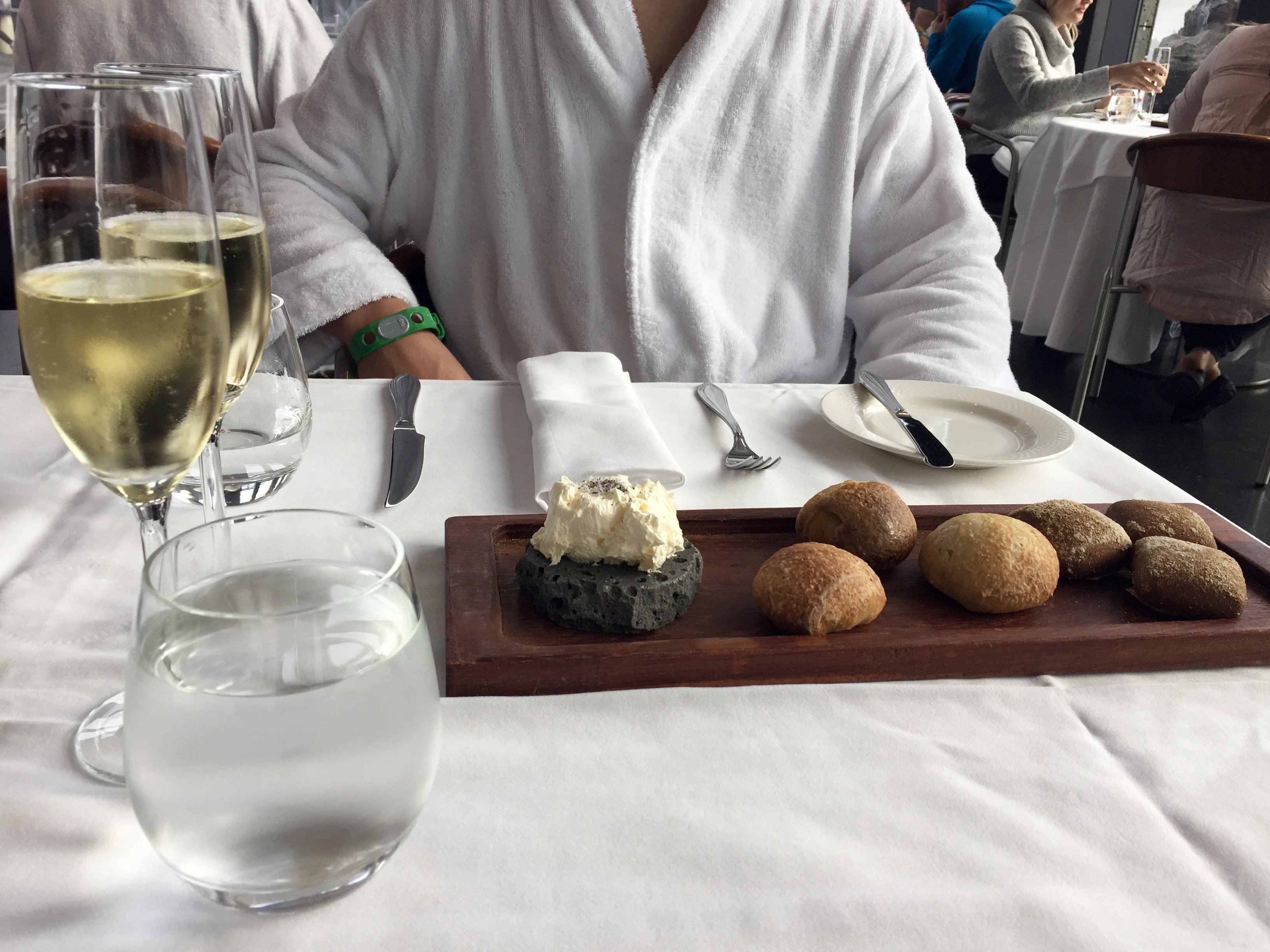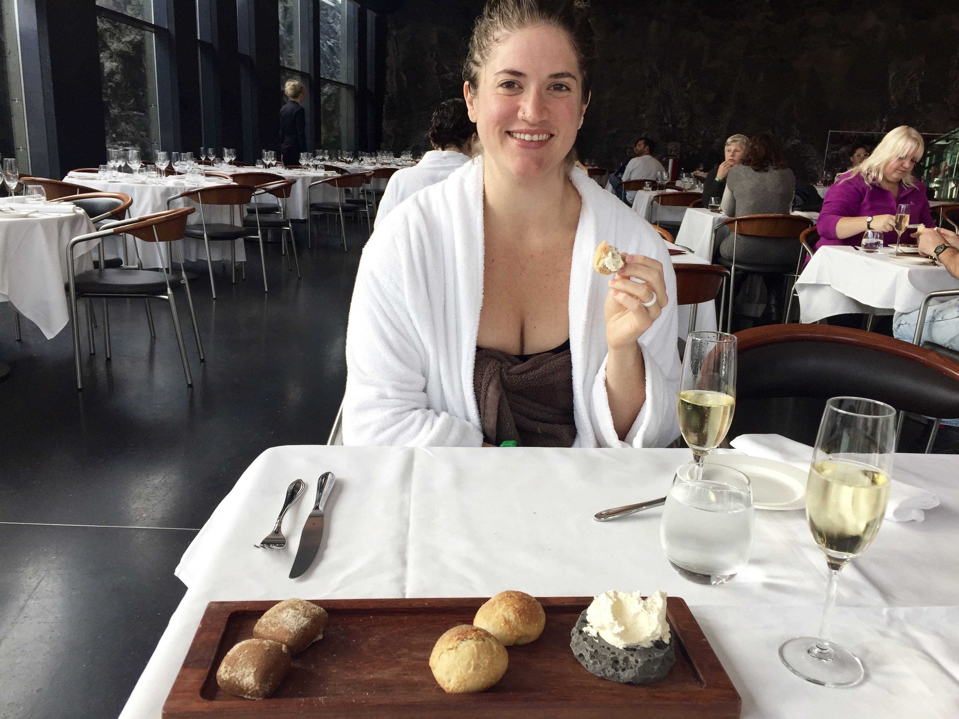 The great thing about this place is that nearly everyone is milling around in white bath robes with flip flops and wet hair. So we were in totally good company at this 5 start restaurant sitting at the table wearing damp robes! If you don’t want to spend this much money on lunch (put us out around 90 bucks to eat here) then there is a simpler cafe option available as well with lots of different lighter fares to choose from. Also, our upgraded package that offered the lunch reservation also came with a free glass of Champagne! We’re basically royalty.