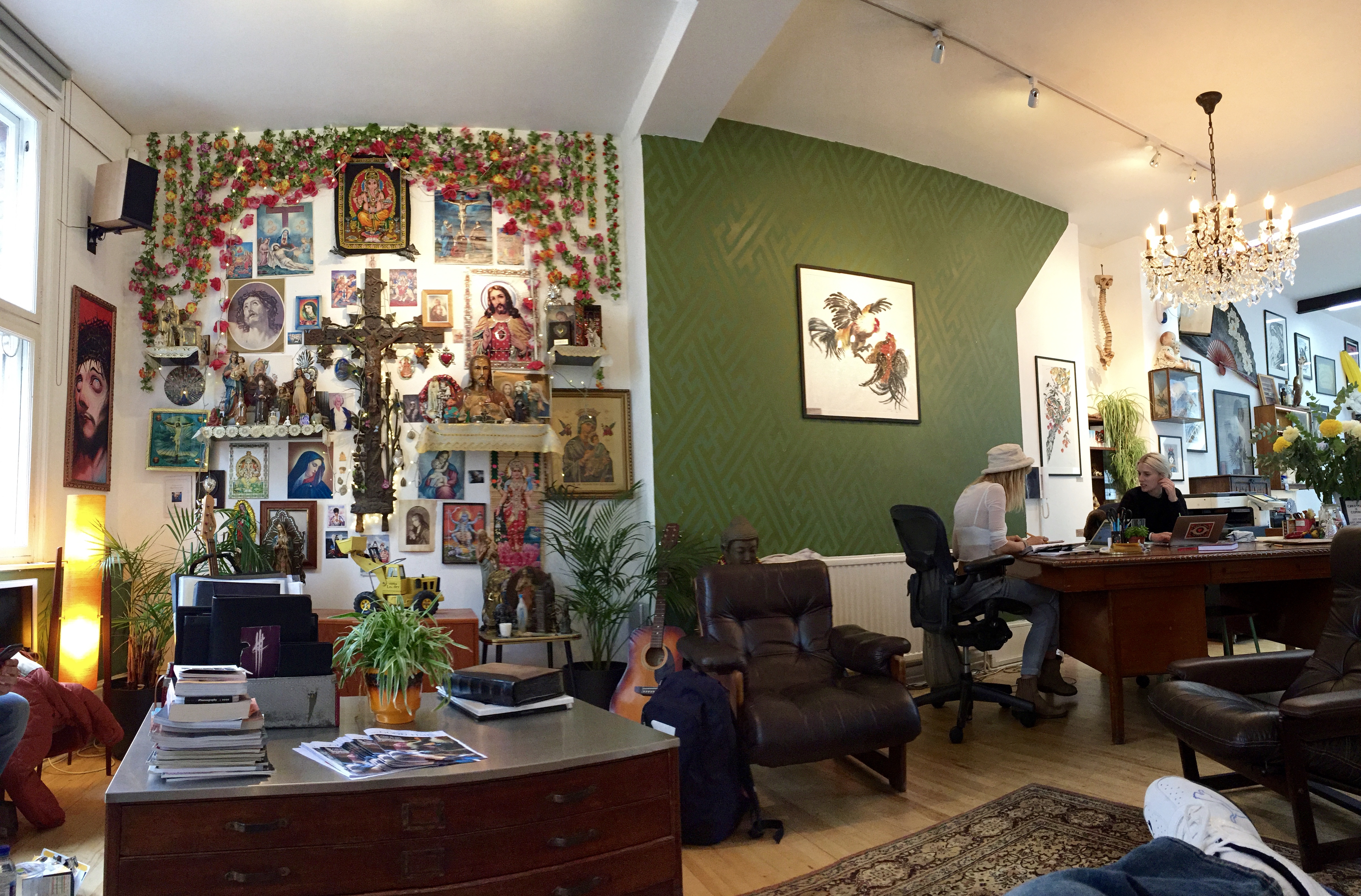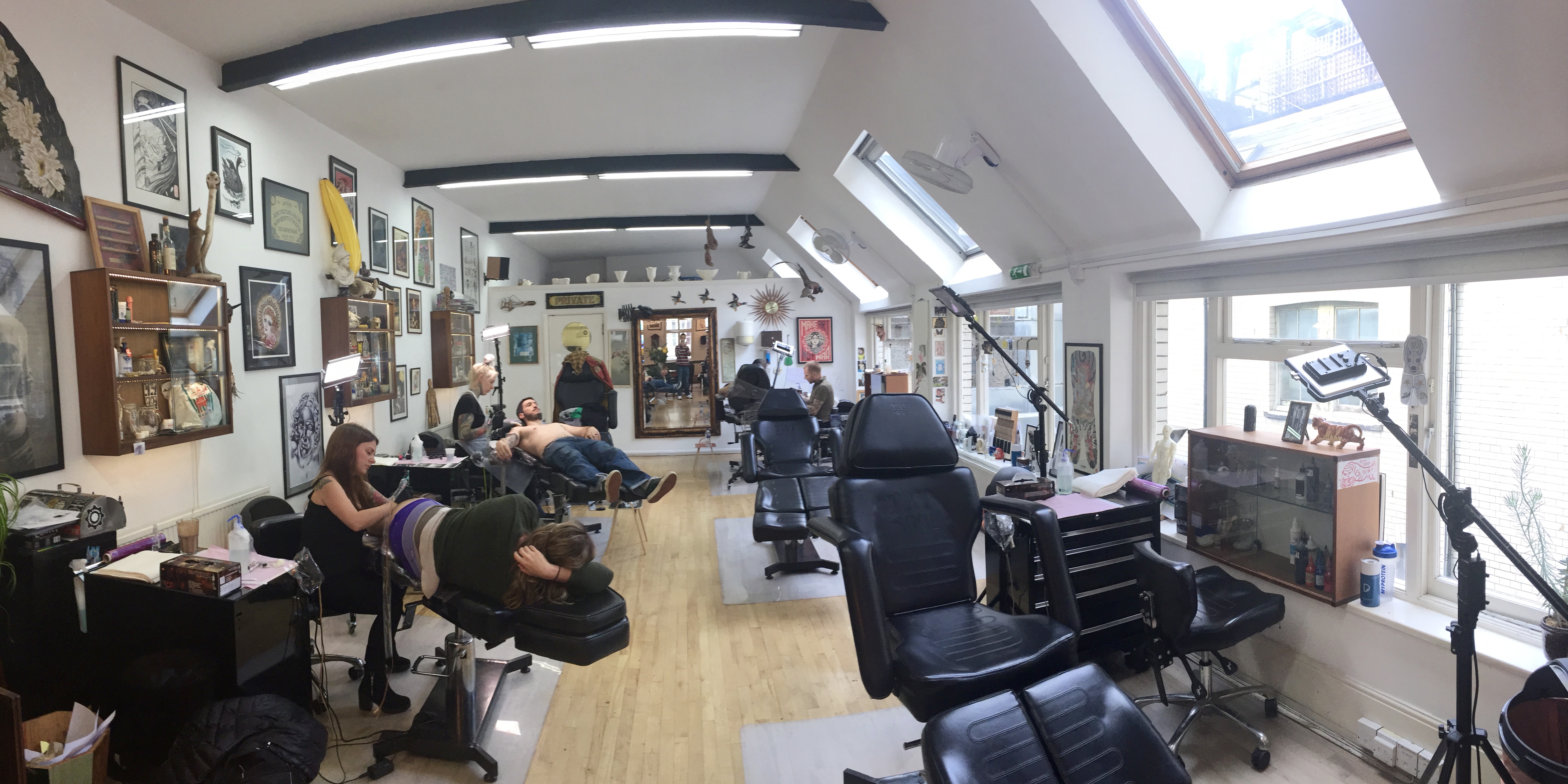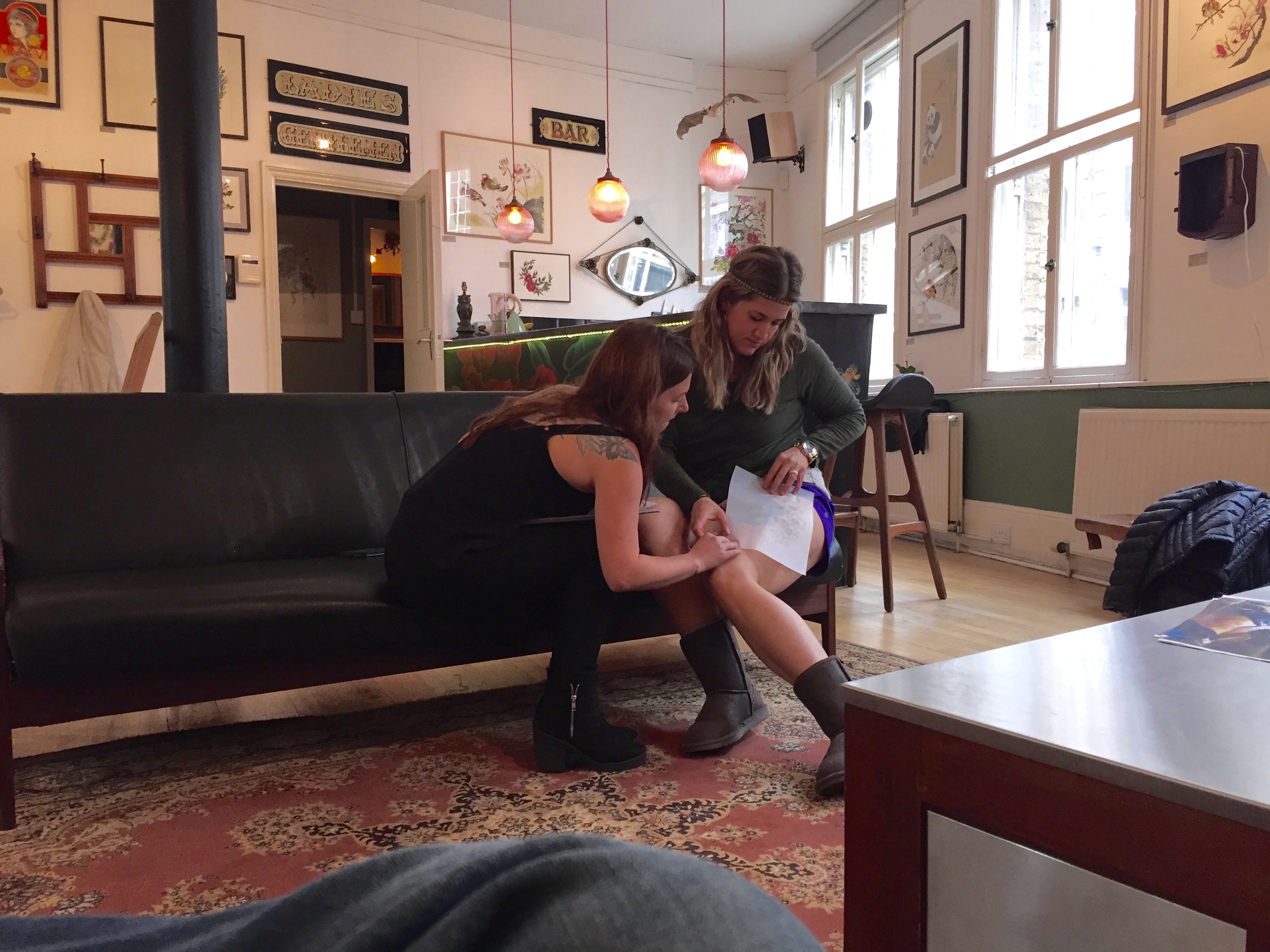 Rob and I arrived at Good Times at noon today, having taken the train to the tube from Lisa’s house. (I’ll address public transit options in my next post about moving and sightseeing through London). I was Harriett’s only appointment for the day, so we could take our time with the set up and artwork, which was nice. The shop is located in an area called “Shoreditch” which is very near downtown and buzzing with activity. There is a bar and a place to eat about every 20 feet or so. It was on the second floor of a building, so there wasn’t really an outside to take pictures of, but I did snap some lovely interior shots of the shop.