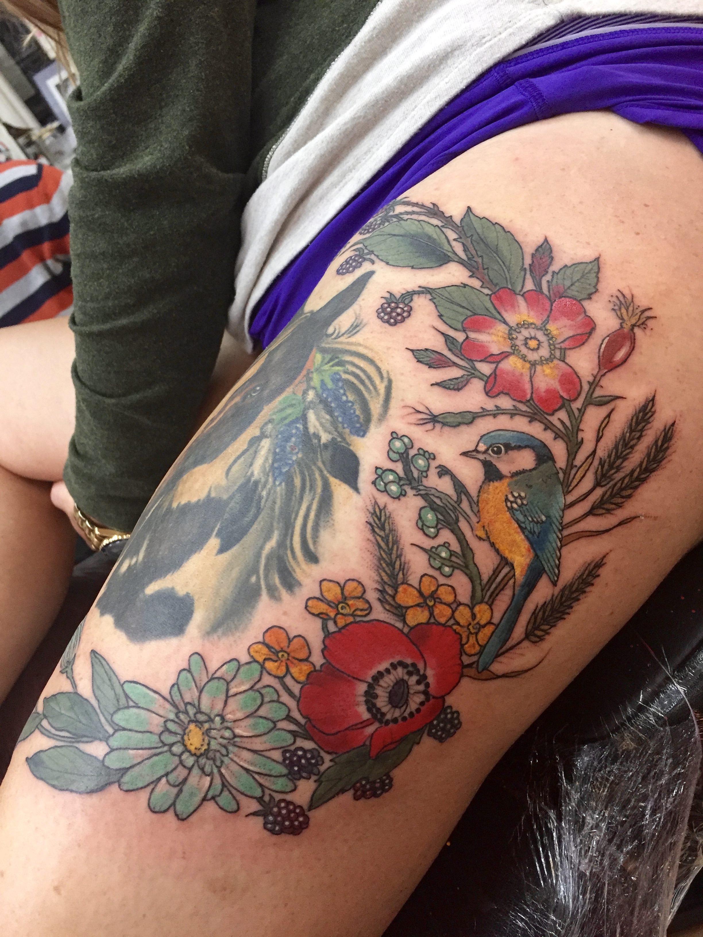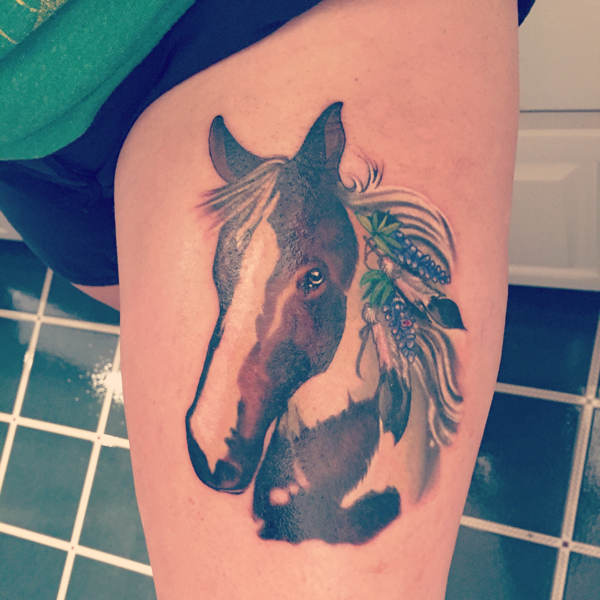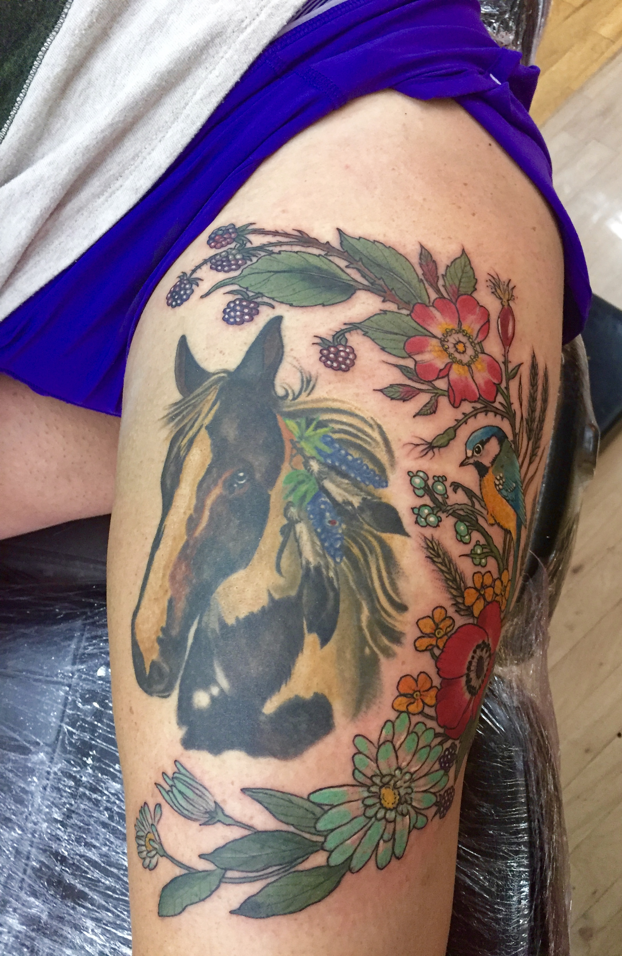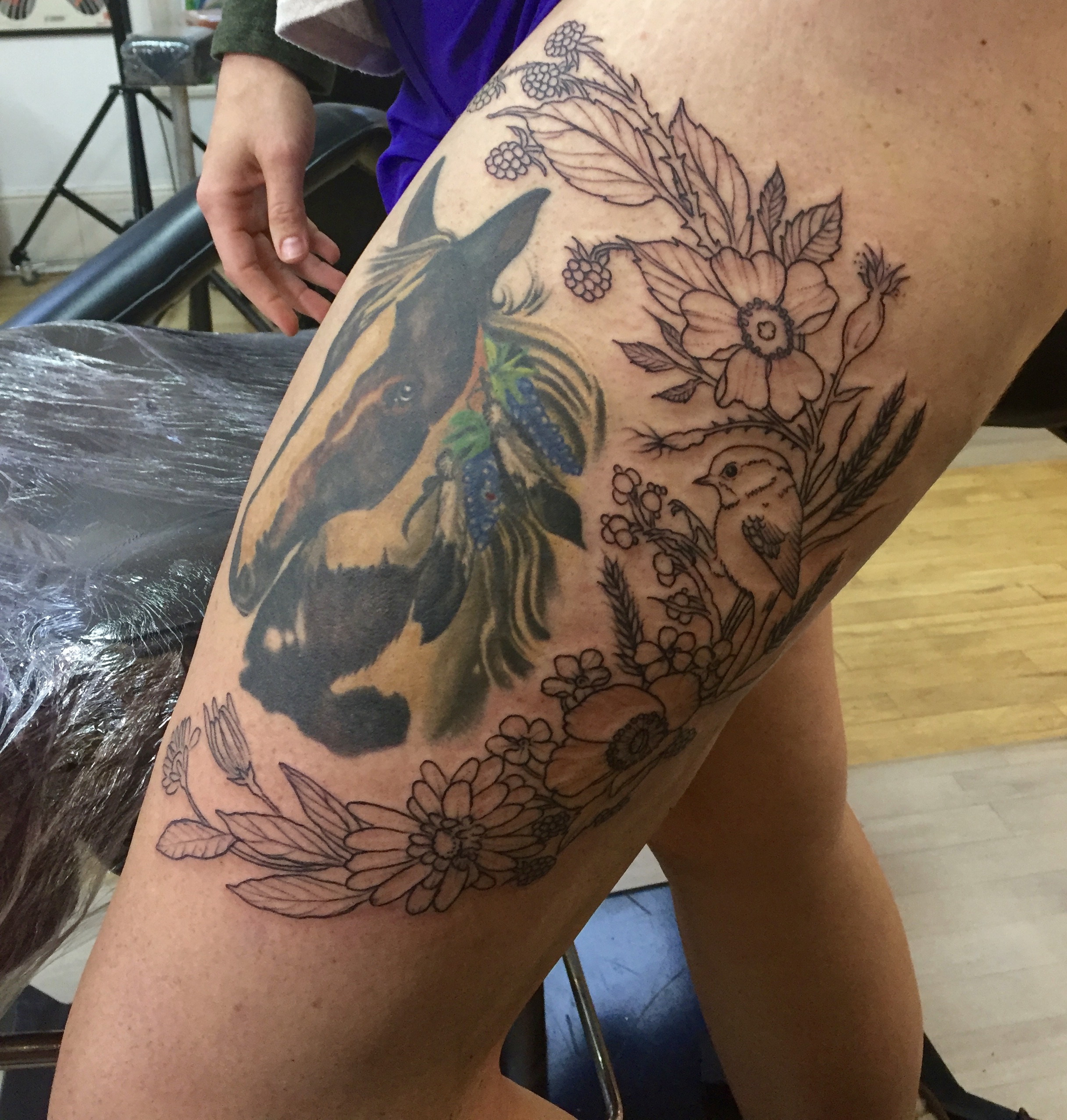 So today wasn’t spent doing any sightseeing, but it was spent doing something I have been looking forward to just the same. Around 8 months ago I decided I wanted my next tattoo to be somewhere on our big trip as a “forever souvenir”. So I began doing some research on shops and artists I was interested in and luckily found Good Times Tattoo, located in London. Then, I found Harriet. So I began following her on Instagram many many months ago and would fawn over every piece she posted; it was as though her and all of her art stepped right out of a fairytale. I knew I wanted to have an addition to my existing Annie tattoo on my thigh (pictured below), and knew she would be able to create the perfect floral scene to accentuate her. So for reference, this was Annie the day I got her from Vic at Blue Rose in Huntsville. (If you want a tattoo in Huntsville, go to Blue Rose!) For those of you who may not know, Annie was my first pony that I got when I was 14, and she remains part of my heart to this day.