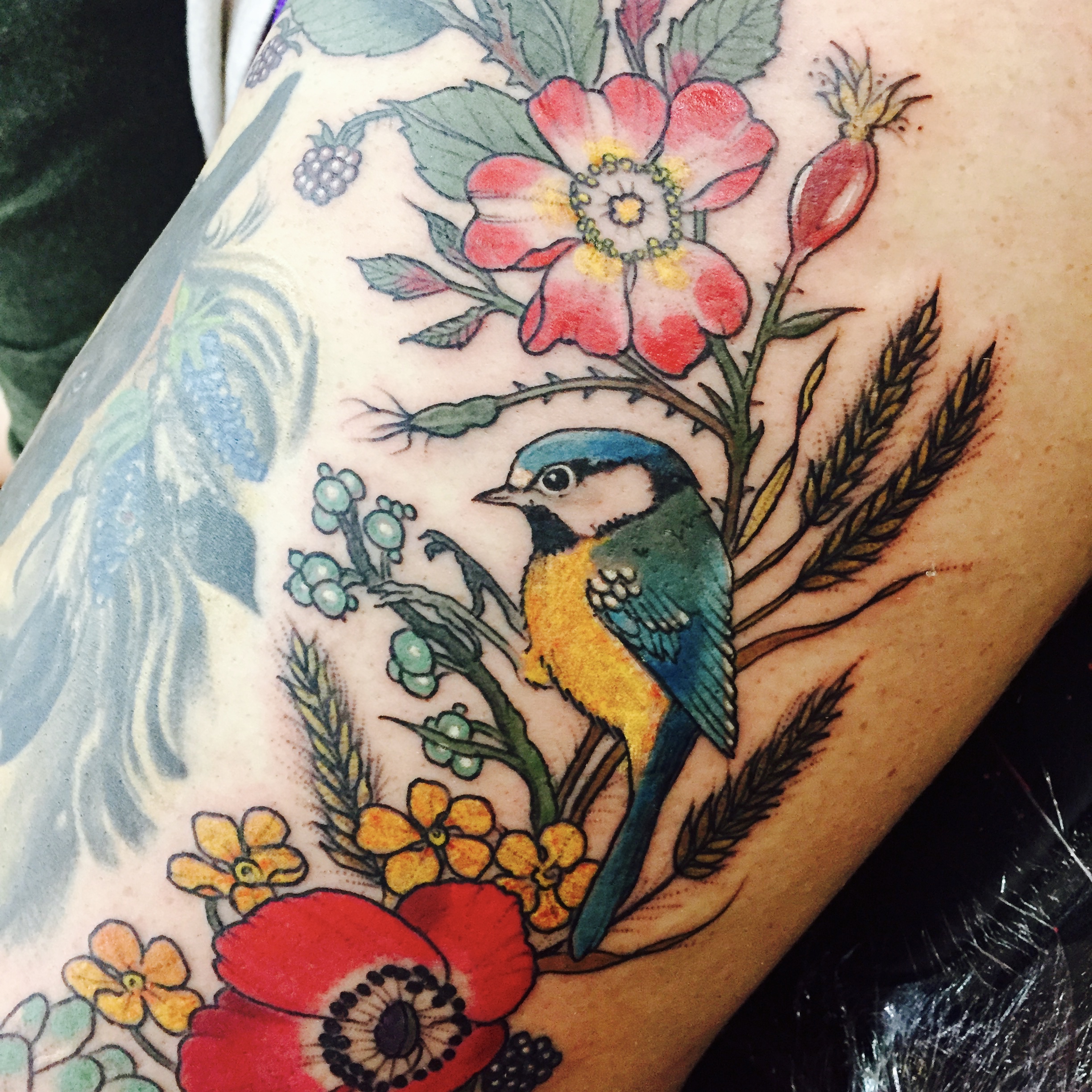 After a bit, I finally got to met Harriet! She was just as friendly and smiley in person as I had imagined her to be. She came out with several little bits drawn up, and then we played around with different flowers, placements and ideas. She took her time, and drew up things as we talked. She would also wind up free handing a lot of this piece. She is an incredible artist and such a lovely person to spend time with.