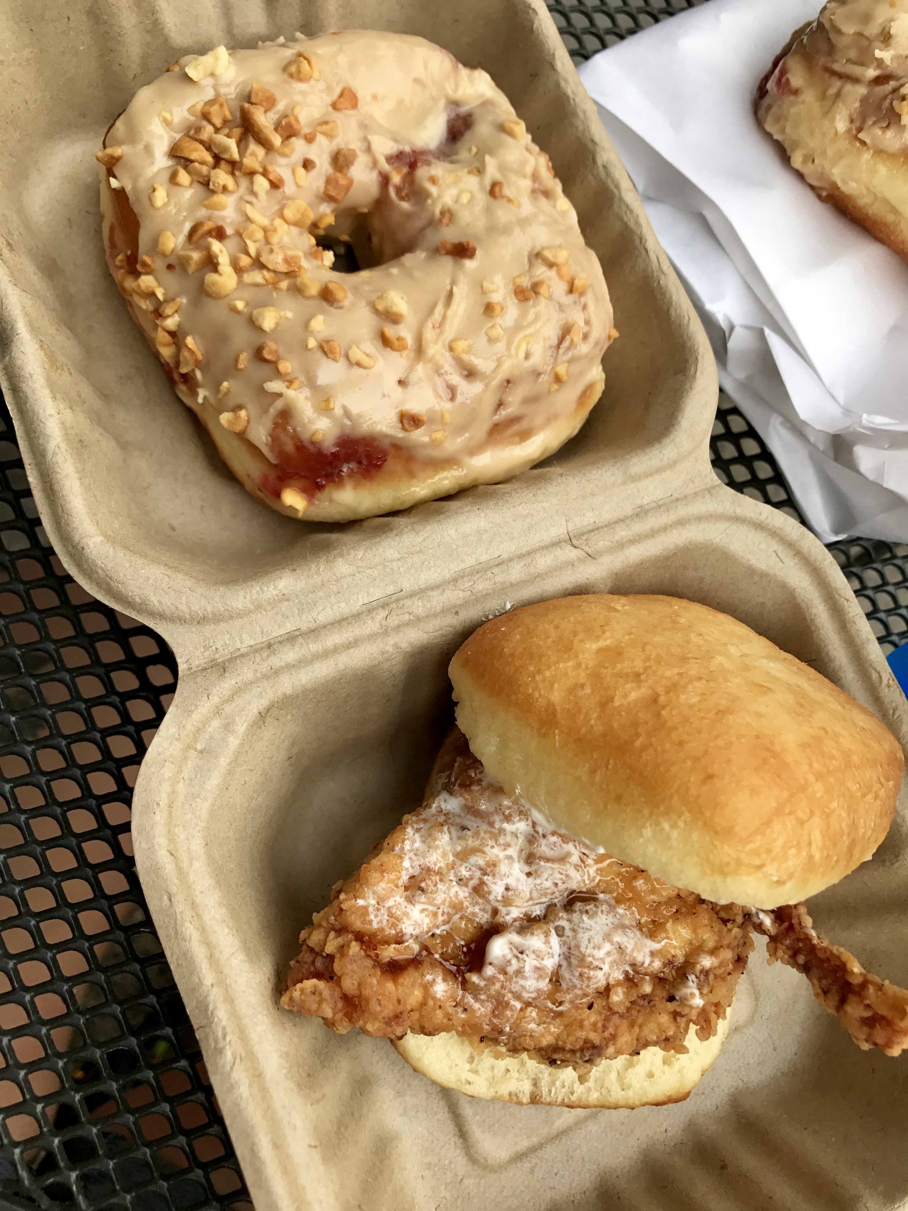 After a quick survey of what was within a short walking distance, we decided on a really intriguing place called Astro’s Donghuts and Fried Chicken. I love scoping out unusual eats when we travel; this place was legit! I’ll let the pictures do most of the talking. It’s a straightforward place – A walk up street shop offering 6 or so different types of gourmet doughnuts and then fried chicken served on buns, biscuits, or really however you want it.